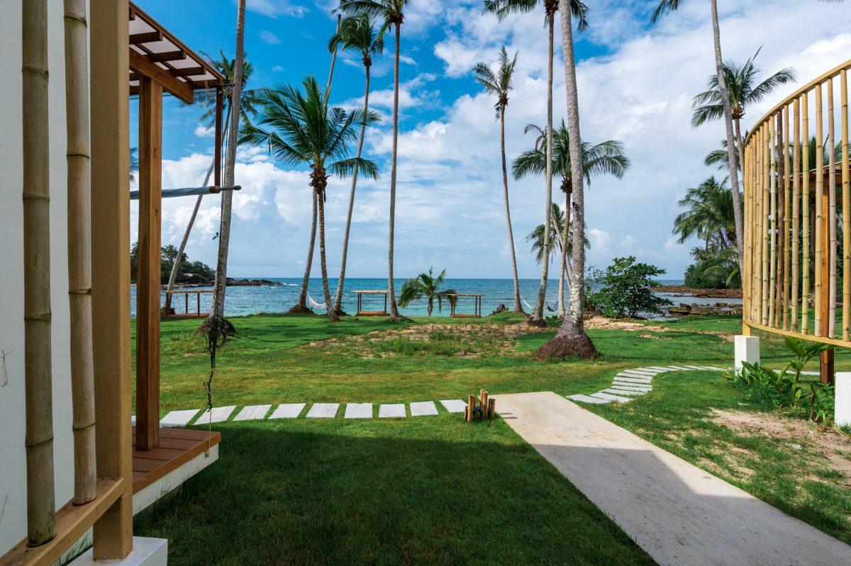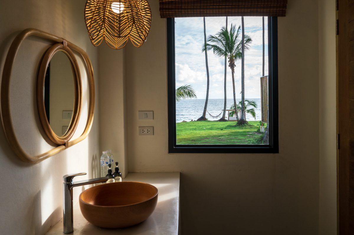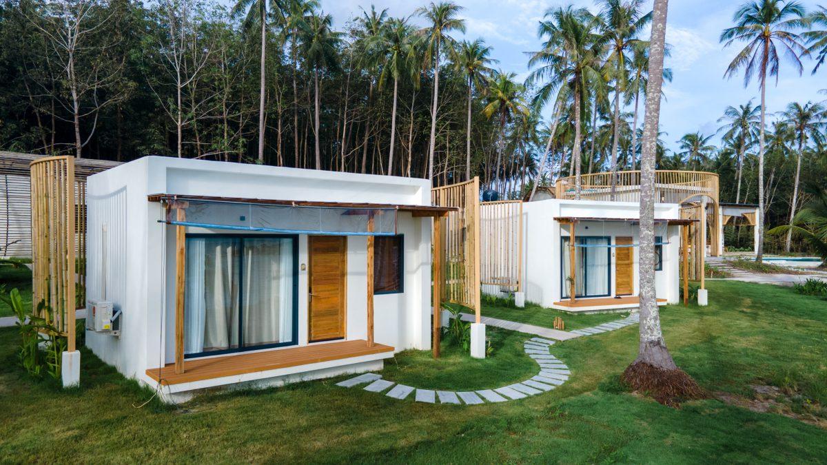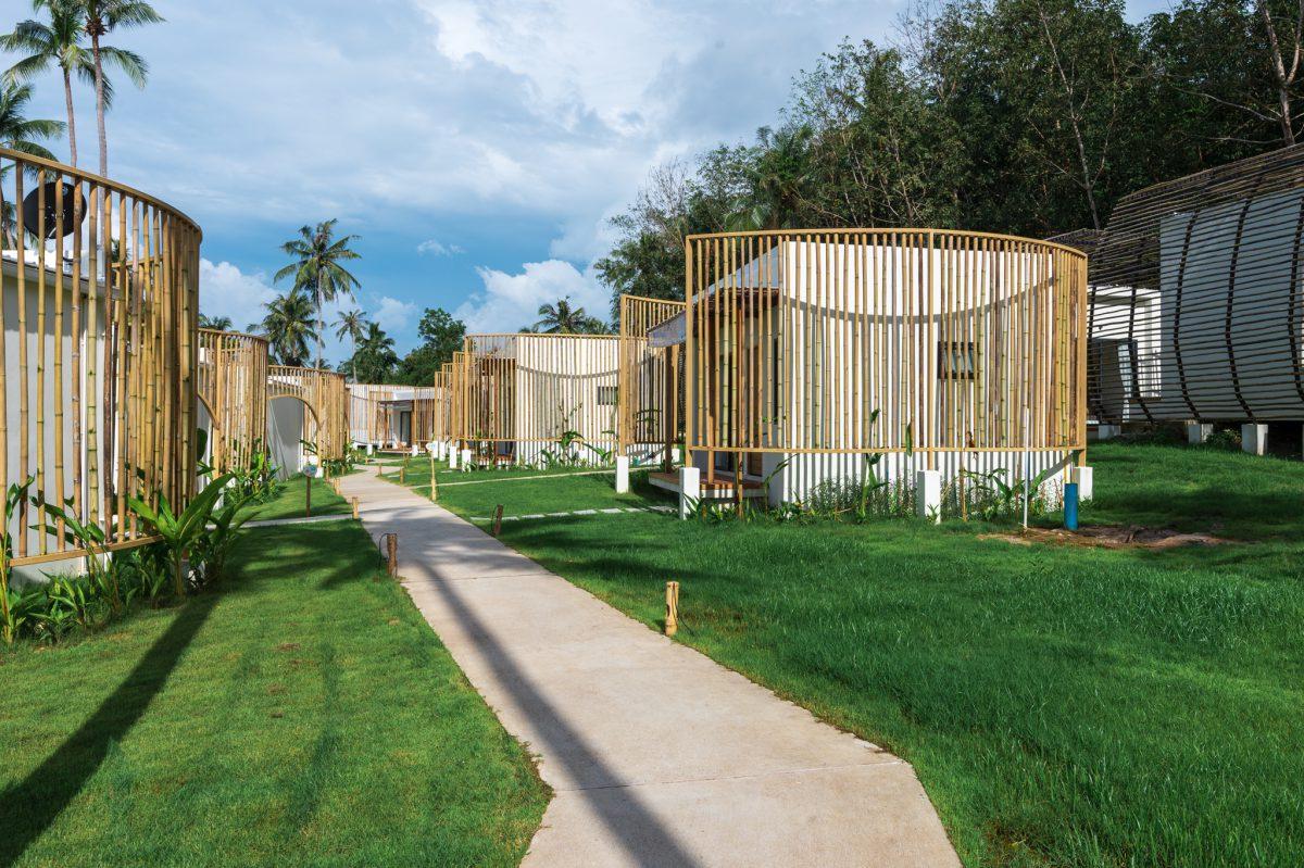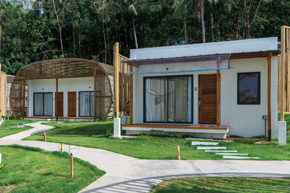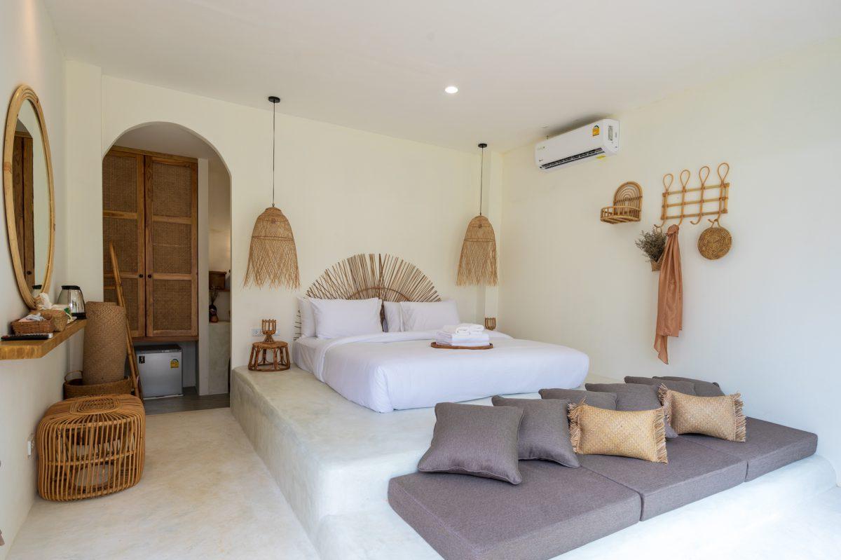 เหนือสิ่งอื่นใด นอกจากบรรยากาศริมทะเลสุดฟิน หัวใจสำคัญที่ทำให้เราต้องเลือกที่นี่ คือห้องพักสไตล์ Modern Tropical ที่ทำได้อย่างอบอุ่น เรียบง่าย ทันสมัย สบายตา ด้วยรูปทรงกล่องสีขาวสไตล์มินิมอลของห้องพักที่แยกตัวออกเป็นหลัง ๆ แต่ผสานกับธรรมชาติได้อย่างลงตัว ไม่ว่าจะเป็นการตกแต่งทั้งภายในภายนอก ที่ใช้วัสดุจากธรรมชาติที่หาได้ง่ายในท้องถิ่นอย่างไม้ไผ่ มาออกแบบเป็นผนังระแนง ล้อมห้องพักทรงกล่อง ให้กลายเป็นสถาปัตยกรรมที่เชื่อมโยงกับธรรมชาติได้อย่างกลมกลืน แถมโดดเด่นเป็นเอกลักษณ์ บวกกับการตกแต่งภายในด้วยเฟอร์นิเจอร์ไม้หวาย คุมโทนด้วยสีเอิร์ธโทน ที่ทำให้บรรยากาศในห้องผ่อนคลายมากขึ้น